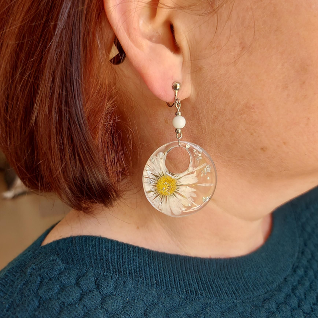 La nature à vos oreilles : Craquez pour ces boucles d'oreilles ornées de véritables fleurs de Pâquerettes séchées, révélant leurs magnifiques beauté. Un cadeau rêvé pour les amoureuses de la nature et des fleurs.